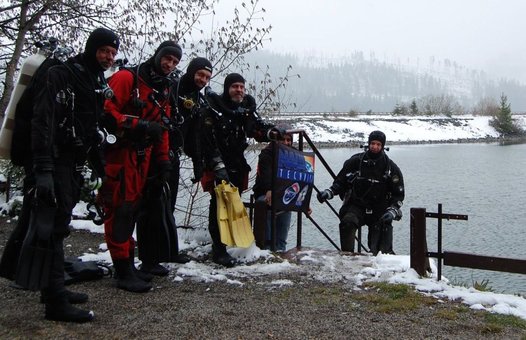 NAUI tech divers from Czech Republic visiting the reservoir in Dedinky, Slovakia, for a spring dive.Only a little snow, no ice, water temperature 5 degrees Celsius (41° F), air freezing. Unfortunately, visibility was no better than a meter (3 feet), but it was a great way to say goodbye to the winter.